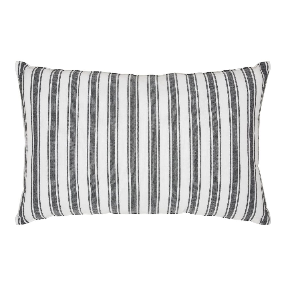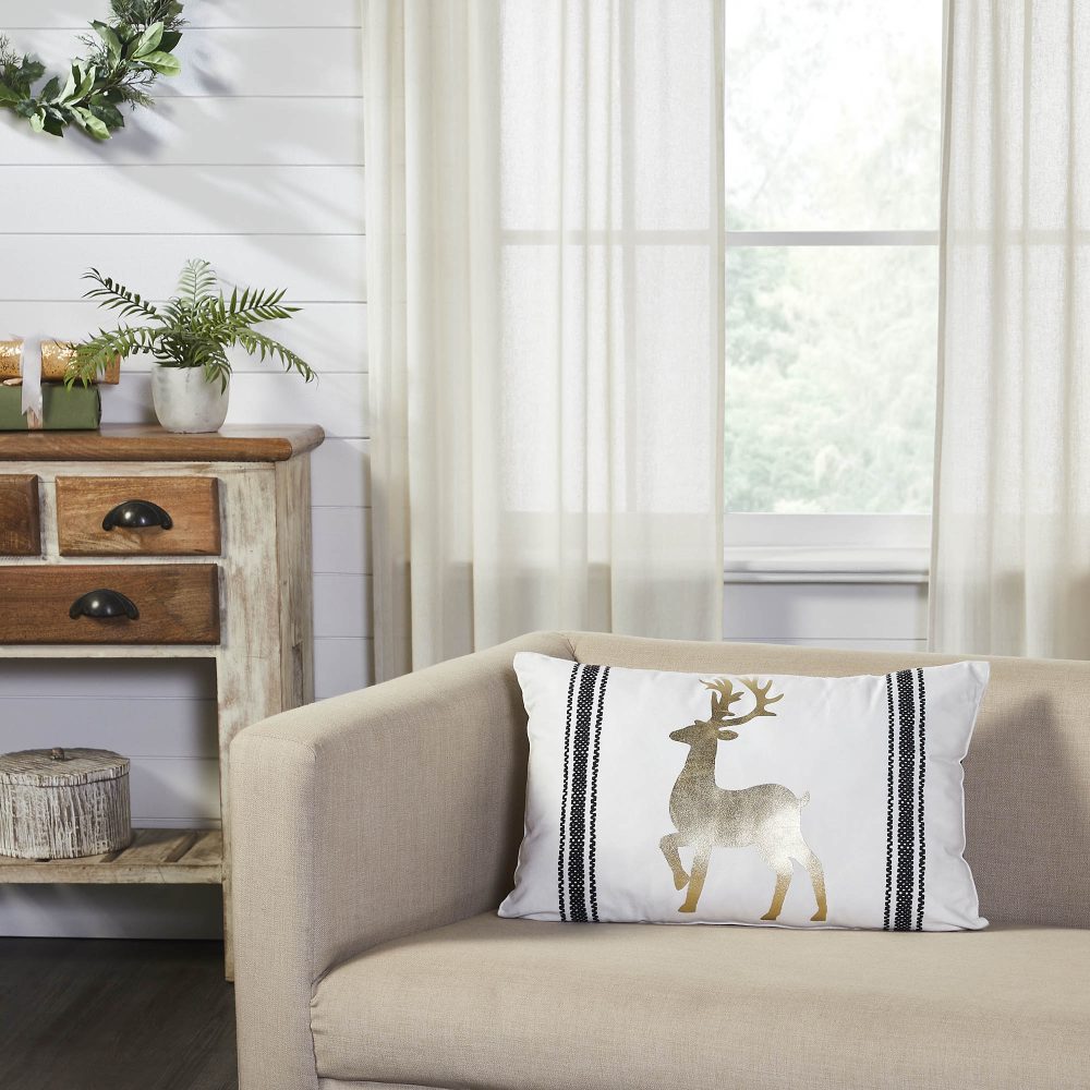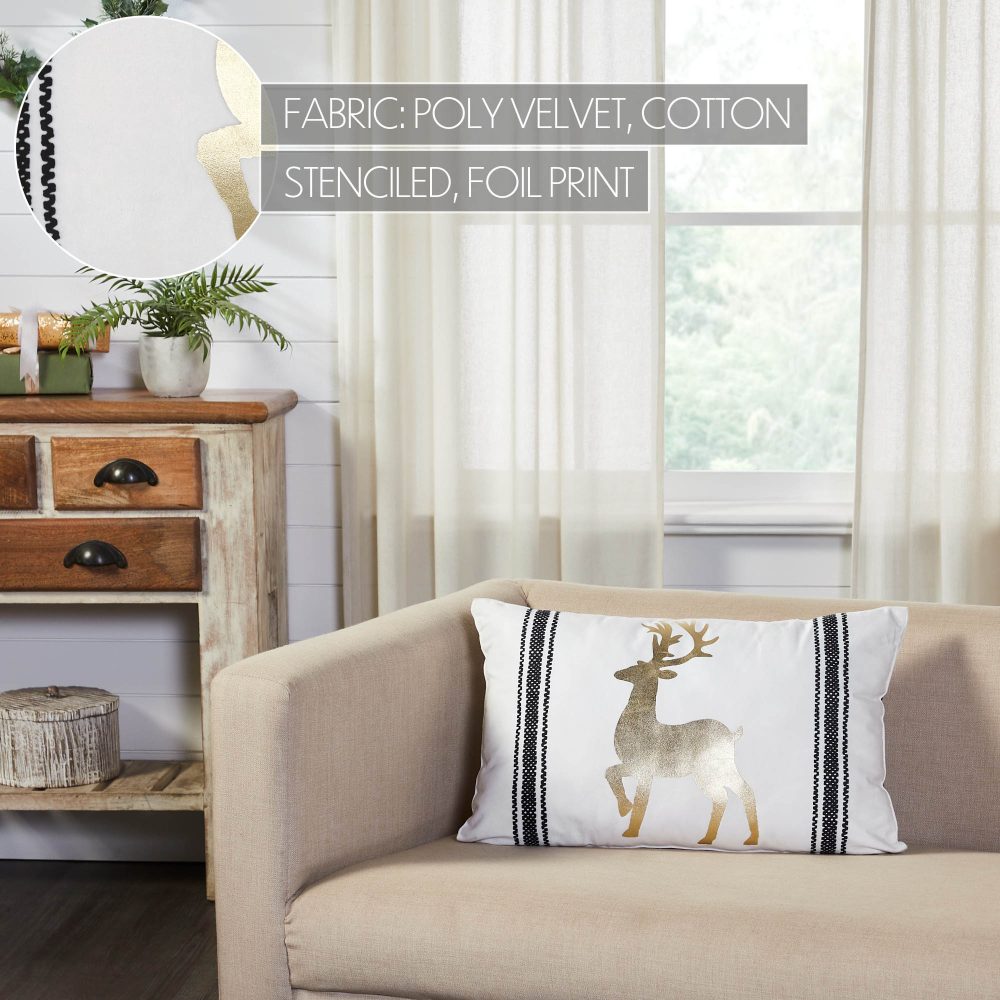 Add a bold and elegant touch to your Christmas decor with a black, white and gold theme. The Wintergleam Reindeer Pillow measures 14x22 inches and is made with 100 percent cotton. The front of the seasonal accent pillow features a striped design printed in solid black surrounding a central reindeer design in gold foil. The filled pillow reverses to a black and white grain sack stripe. Coordinates with the Wintergleam Collection by VHC for bold and elegant Christmas style for the entire home.