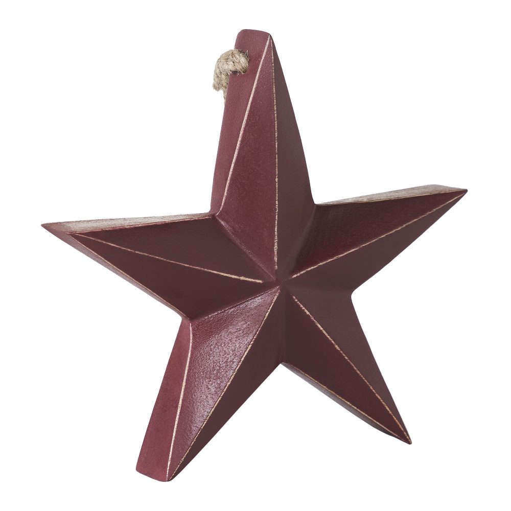 • Patriotic Wooden Star Ornament in Burgundy: The VHC Brands Patriotic Wooden Star Ornament, measuring 8x8x1.5, is a striking Independence Day decor piece. Crafted from tropical wood, this ornament features a rich burgundy finish for a bold and festive look.