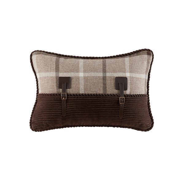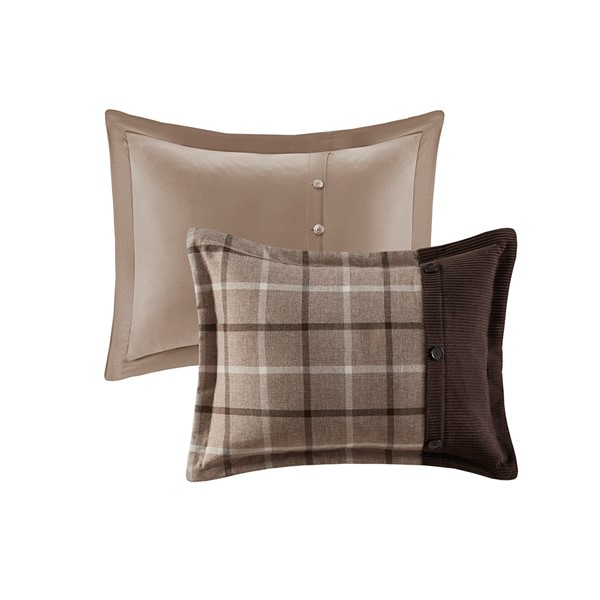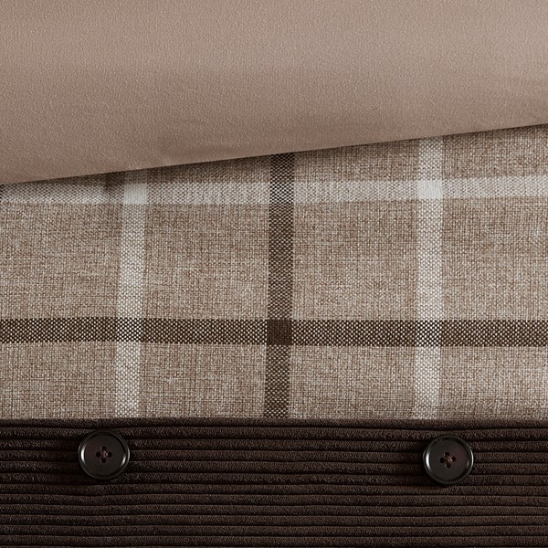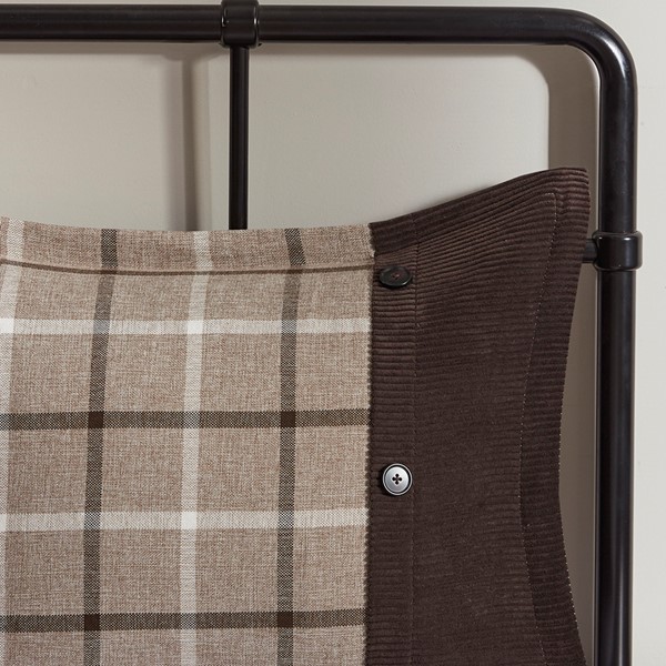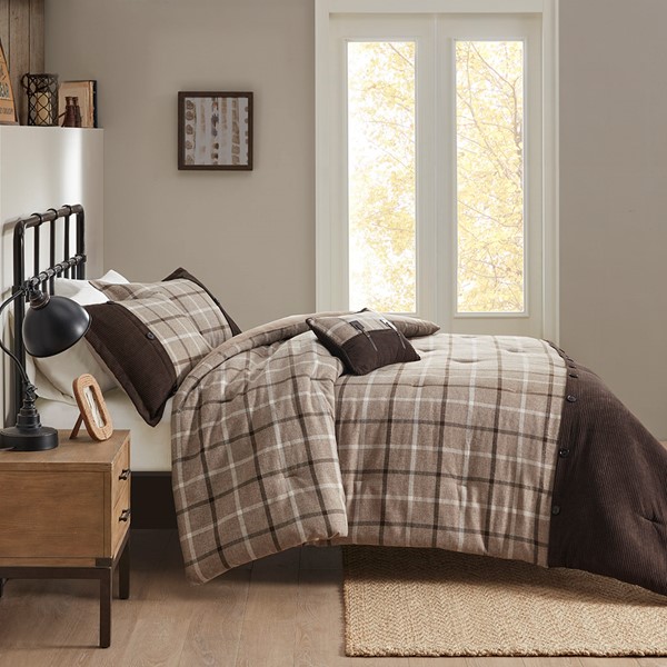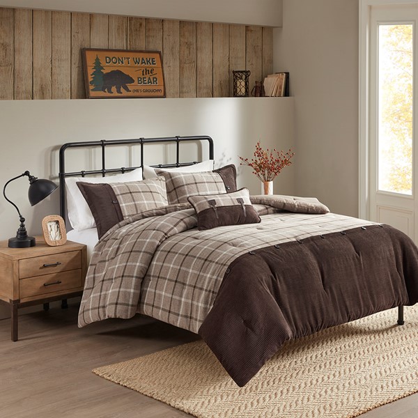Create that perfect cabin aesthetic in your bedroom with the Woolrich Anaheim 4-Piece Plaid Comforter Set. This woven jacquard comforter features a tan and brown plaid pattern pieced with solid brown corduroy at the foot of the bed. Two matching shams mirror the design of the oversized comforter, for a coordinated lodge look. Button accents on the comforter and shams add dimension, while an oblong decorative pillow provides the finishing touch.