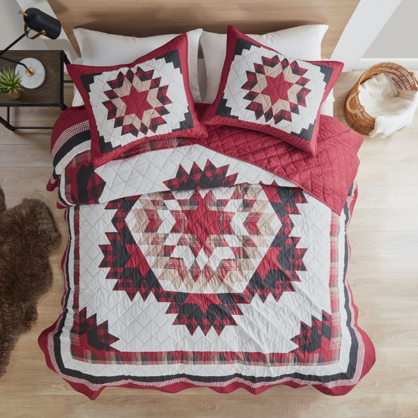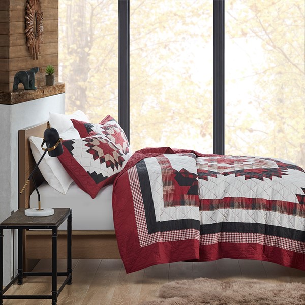 Easily create a cozy cabin look in your bedroom with the Woolrich Compass Quilt Mini Set. This cotton quilt features a large medallion in the center, in red, black, and brown colors, framed by accenting borders, for a charming country look. The solid red reverse complements the pattern on the bed, while end-to-end diamond quilting adds texture and dimension. Coordinating shams also showcase a medallion motif that pairs handsomely with the quilt. Prewashed for comfort and durability, this quilt mini set has 90% cotton filling to provide exceptional warmth and a soft feel. This quilt mini set is machine washable and OEKO-TEX certified, meaning it does not contain any harmful substances or chemicals to ensure quality comfort and wellness.