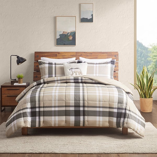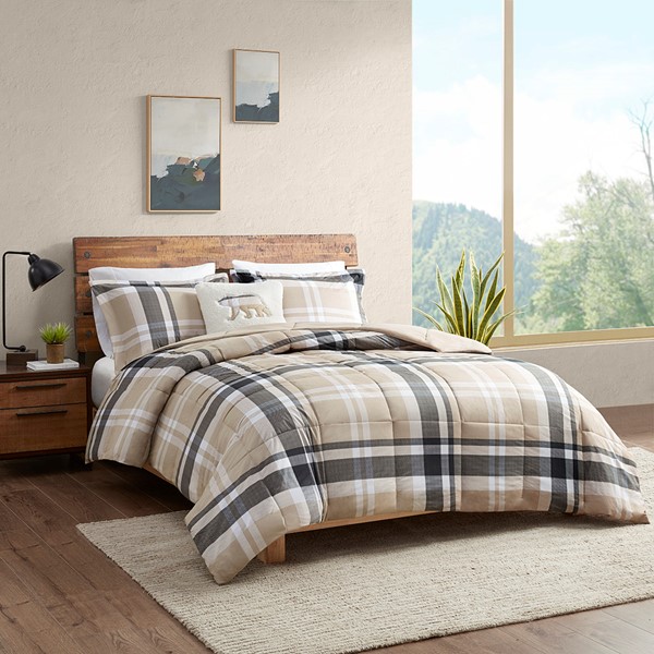 This comforter set features a printed plaid design, constructed of softspun material which has a flannel-like feel for year-round comfort. The neutral hues provide a modern farmhouse look to accent your bedroom decor. The set is complete with comforter, pillow shams (1 in twin) and a sherpa decorative pillow with a bear motif for an added cozy touch. The super soft texture is OEKO-TEX certified and machine washable for convenience and peaceful relaxation every night.