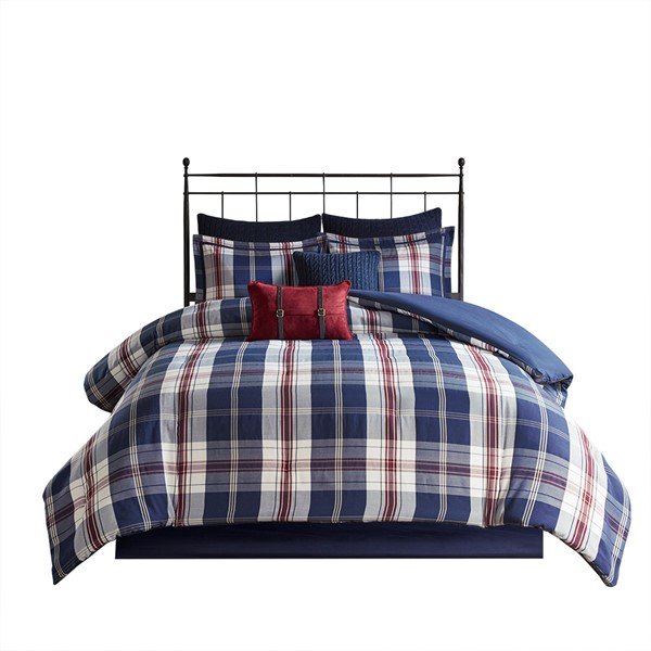 * All over plaid in blue and red jacquard print comforter set