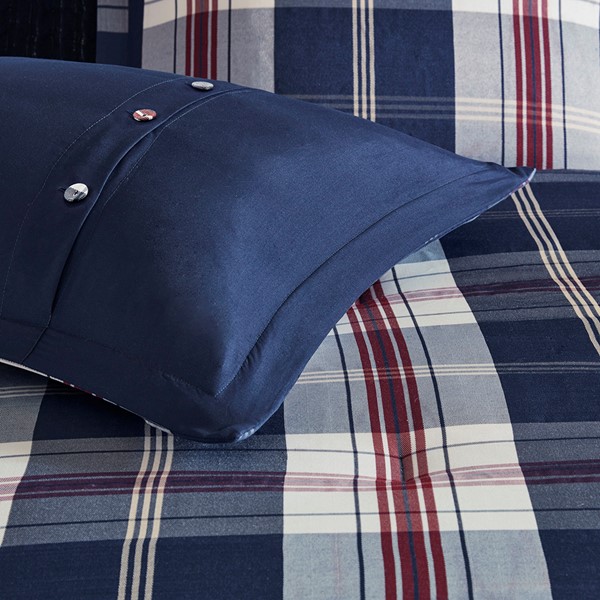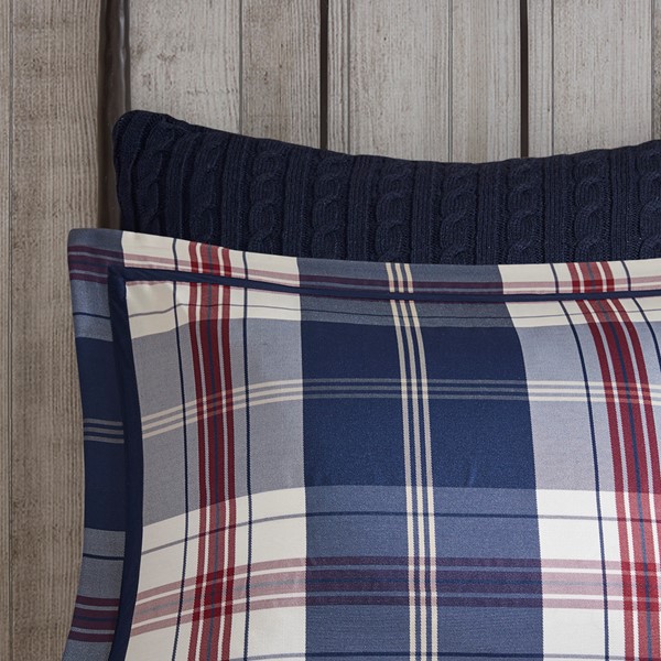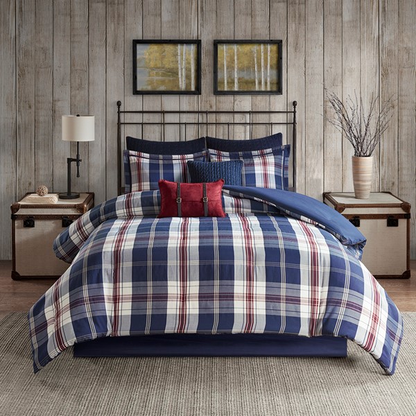 Keep warm and cozy with the Woolrich Ryland Comforter Set. The oversized comforter features an all-over jacquard plaid pattern in red and blue hues, creating an inviting cabin allure. Coordinating shams (1 sham in Twin/TwinXL sizes) repeat the design of the plaid comforter, while a solid navy bed skirt provides a clean finish to the cabin-style bedding. Machine washable for easy care, this oversized plaid comforter set transforms your bedroom into a casual cabin retreat. Other bedding accessories such as euro shams and decorative pillows are sold separately.