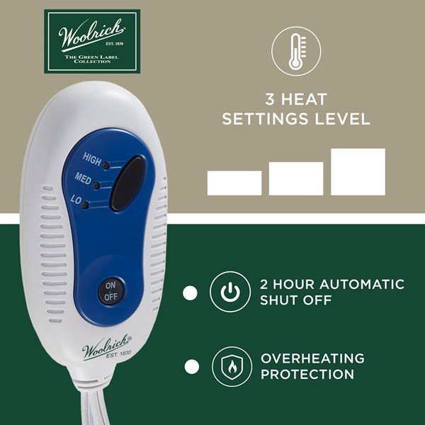 The Woolrich heated throw utilizes state of the art Secure Comfort heated technology that adjusts the temperature of your throw based on overall temperature, spot temperatures and the ambient temperature of your room, ensuring a consistent flow of warmth. This unique technology also emits virtually no electromagnetic field emissions, so you can snuggle up with confidence. This throw is oversized, nearly a foot larger in the length and width compared to standard heated throws. The ultra soft plush fabric and the lofty berber reverse creates a cozy, comfortable throw. Featuring 3 heat settings, this throw is machine washable for easy care and OEKO-TEX certified, meaning it does not contain any harmful substances or chemicals to ensure quality comfort and wellness. Includes manufacturer’s 5-year warranty.