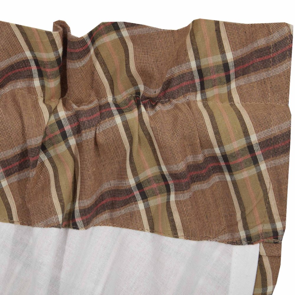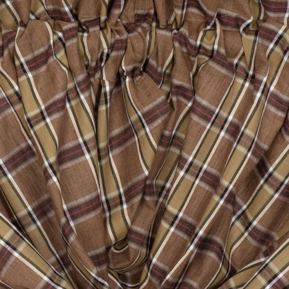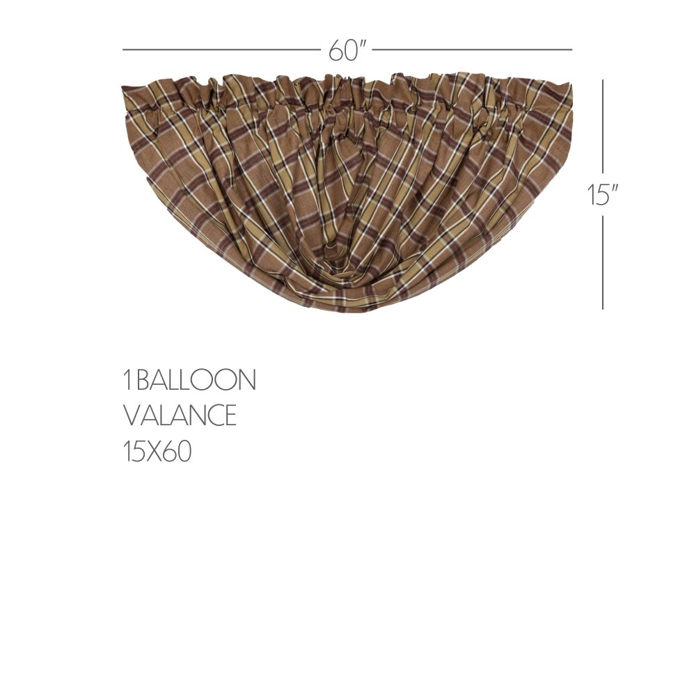 Dress your kitchen windows in rustic yet stylish simplicity with the Wyatt Balloon Valance. This plaid curtain features tan, crimson, black, and moss green shades that effortlessly remind one of the deep woods and helps create a cozy frame around your window's woodland view. This 15" x 60" kitchen curtain is lined with white cotton to prevent the sun's glare and has a rod pocket for easy hanging.