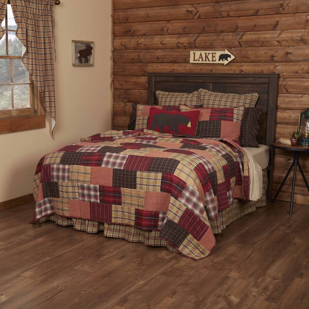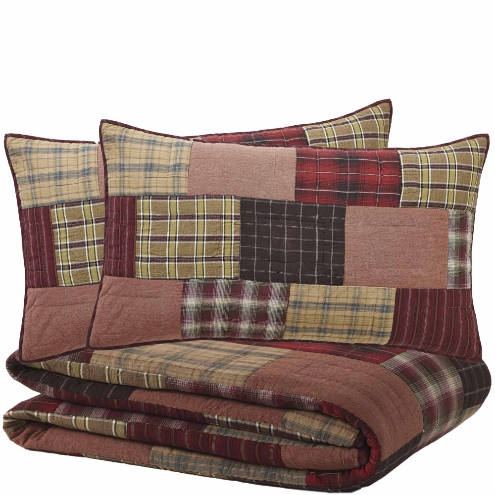 Add bold, rustic country style with bright plaids in crimson red and deep espresso brown. The Wyatt Three-Piece California King Quilt Set includes one 130x115-inch quilt and two 21x37-inch quilted pillow shams. The classic country bedding set features real, traditional quilt blocks in bold patterns for an adventurous look. An asymmetrical design with rectangular blocks adds cozy backwoods charm to your bedroom. All items are machine washable and iron safe and crafted in 100 percent cotton for a soft feel and durable wear. Both the quilt and shams reverse to a soft khaki and moss green plaid. Coordinates with the Wyatt Collection by VHC for matching rustic cabin window treatments, bathroom accessories and bedding to bring the best of eye-catching country style to every corner of your home or lodge.
