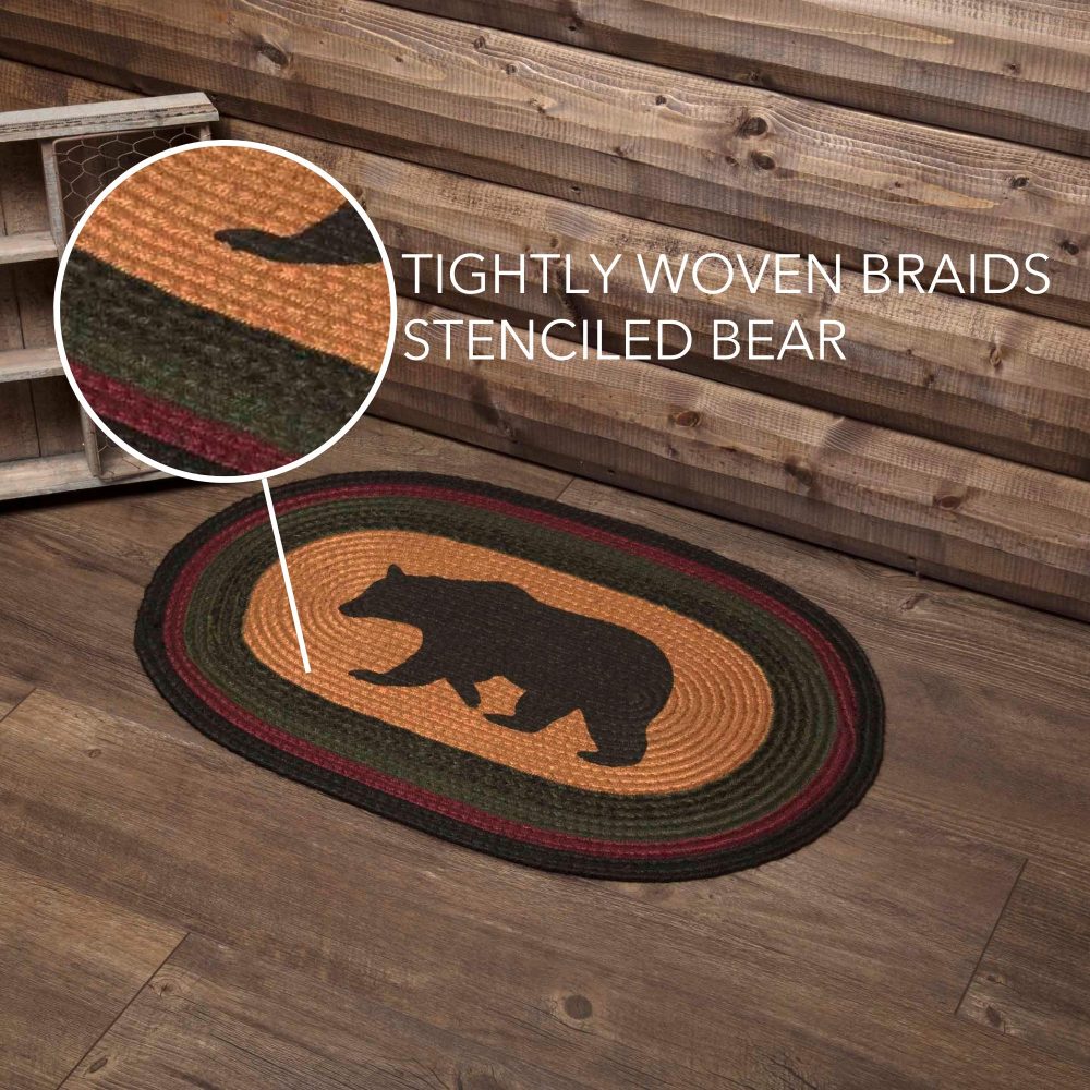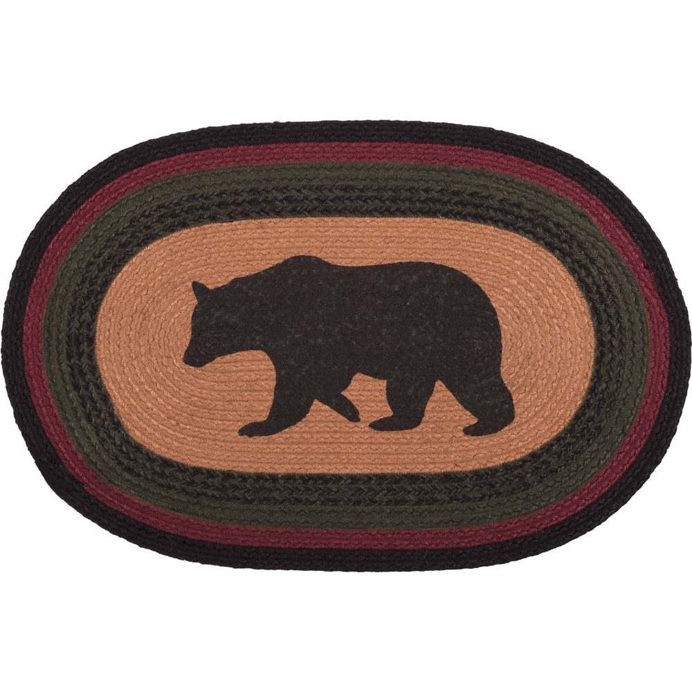 Add a sense of adventure and deep woods style with bold colors and iconic mountain imagery in a curl-resistant jute blend that adds style and safety anywhere a small accent rug is needed. The Wyatt Stenciled Bear Jute Rug measures 20x30 inches and features a classic oval shape and tight braids constructed with a durable jute blend. The special blend relaxes faster and stays flat. Features a blend of inky black, army green and deep red surround a tan central design of a stenciled bear silhouette for a dark, rustic look that complements a wide array of country cabin and lodge decor.