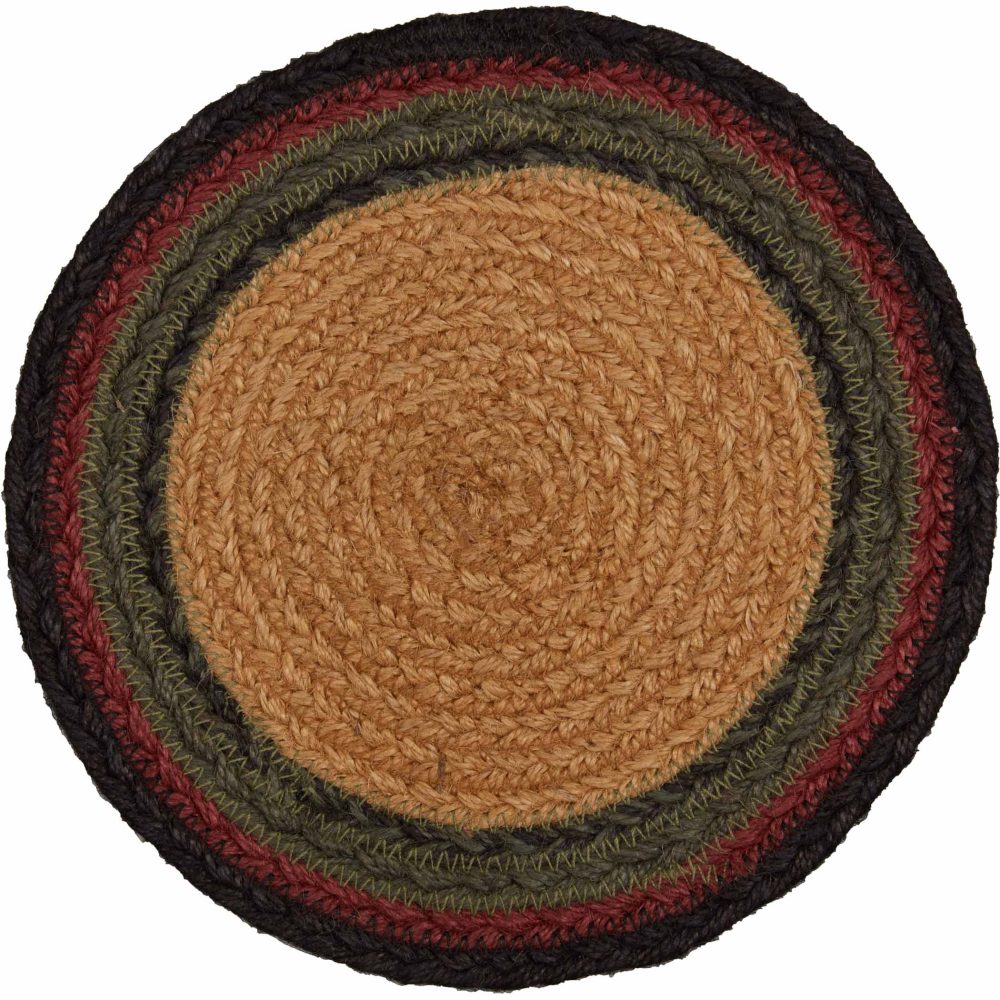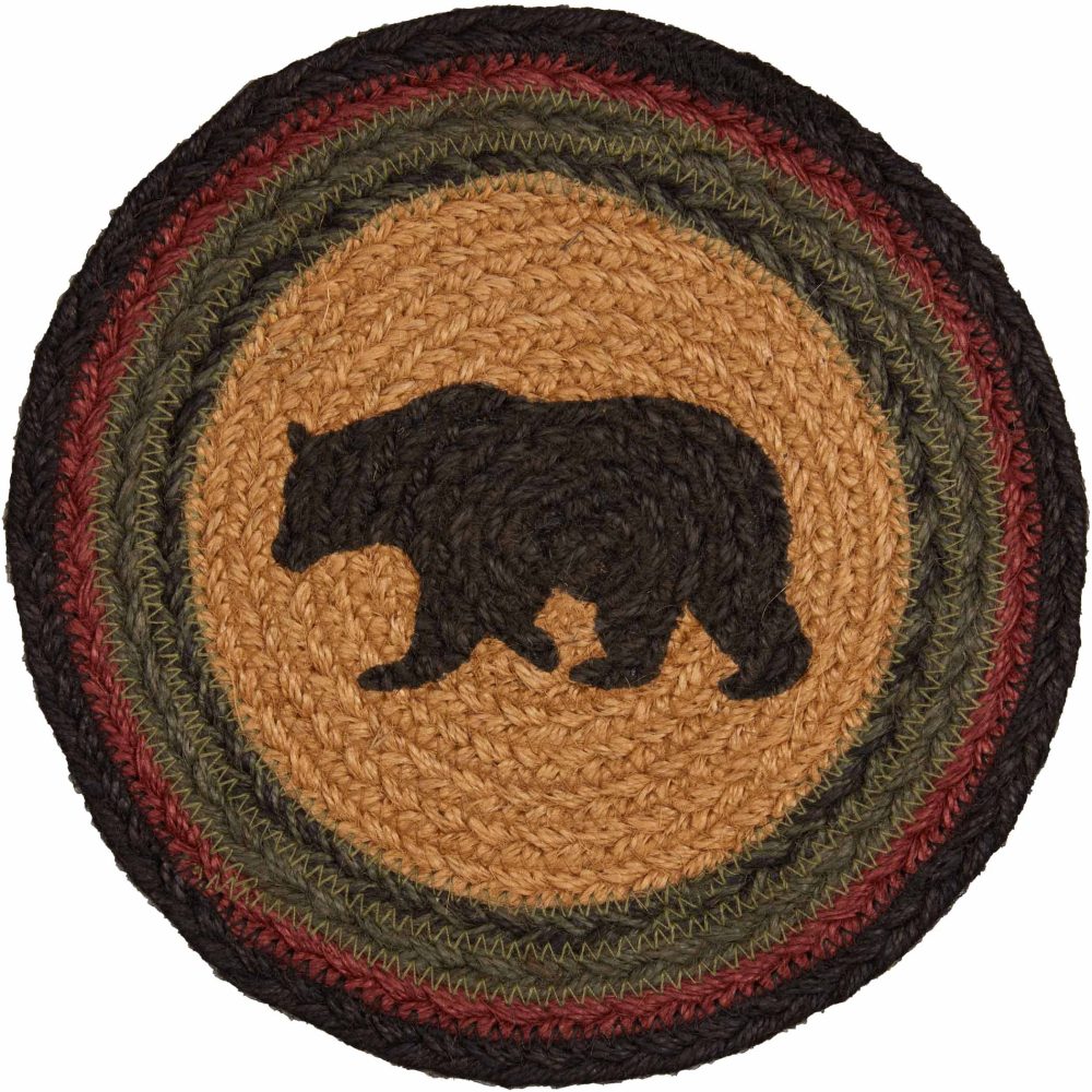 Who says trivets have to be boring? Protect counters and tables from hot pans and dishes with bold, adventurous color and classic texture. The Wyatt Stenciled Bear Jute Trivet includes one circular trivet with a 8-inch diameter made from a premium Jute blend. The rich texture of braided jute is given a modern twist with black and red striping framing a central black bear design. Complete your tabletop decor with other pieces from the Wyatt Collection by VHC for rustic country cabin style.