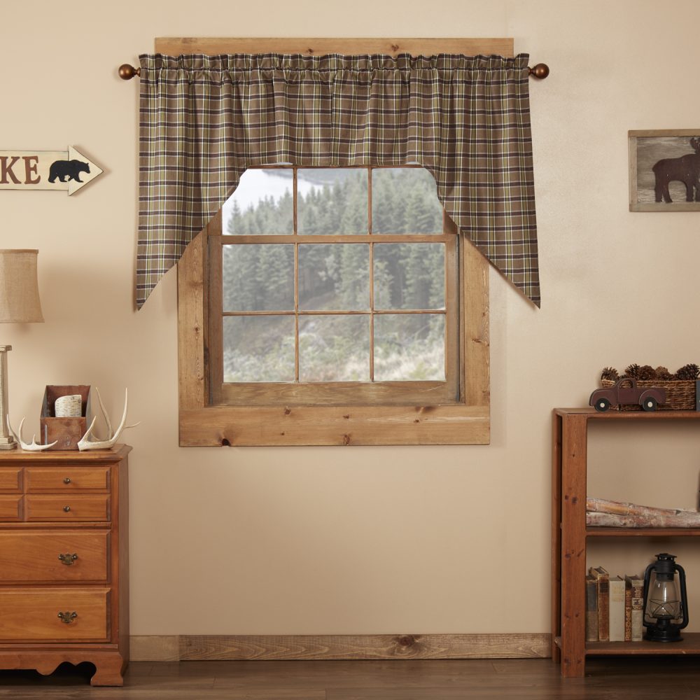 Decorate your windows with a touch of rustic, mountain country style with this charmingly designed and thoughtfully crafted window swag set. Displaying a timeless country look with a bold plaid with wide stripes of tan accented by deep black, muted mossy green and pops of crimson red, the Wyatt Swag Set 36x36x16 enhances your home decor with a modern country feel. This 100% cotton curtain set includes two short swag-style panels with a white lining to prevent fading and provide additional privacy. It includes a rod pocket for easy hanging.