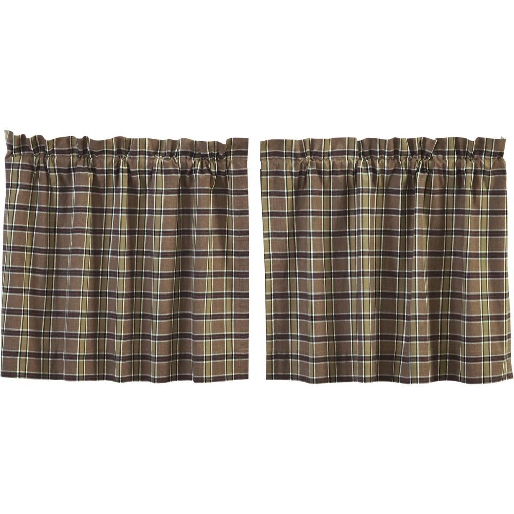 Dress your kitchen windows in rustic yet stylish simplicity with the Wyatt Tier Set. This plaid curtain features tan, black, and moss green shades that effortlessly remind one of the deep woods and helps create a cozy frame around your window's woodland view. This 24x36 inch kitchen curtain is lined with white cotton to prevent the sun's glare and has a rod pocket for easy hanging. 100% cotton.