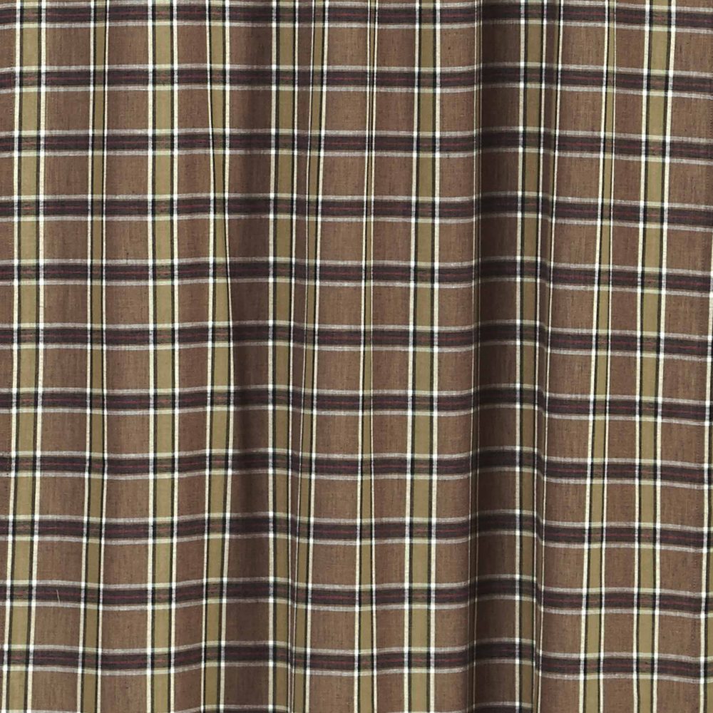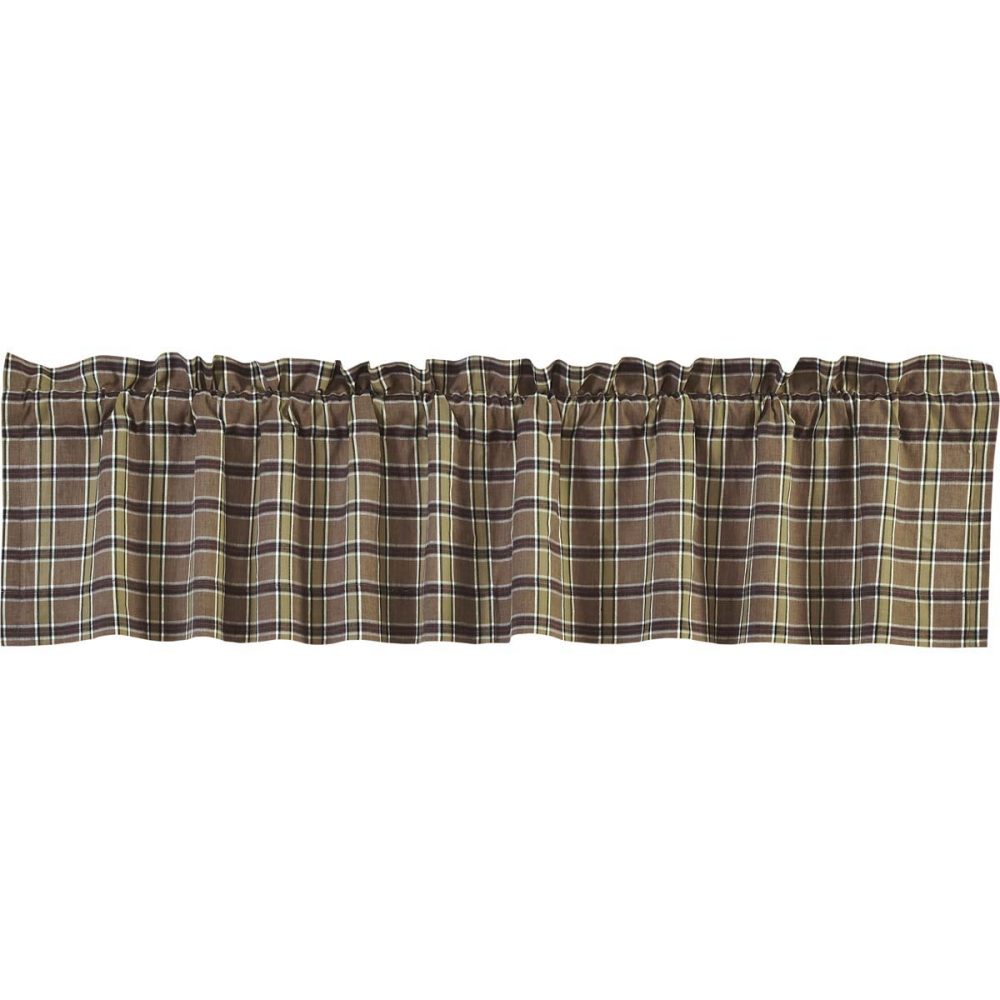 Dress your kitchen windows in rustic yet stylish simplicity with the Wyatt Valance. This plaid curtain features tan, crimson, black, and moss green shades that effortlessly remind one of the deep woods and helps create a cozy frame around your window's woodland view. This 16 x 72 kitchen curtain is lined with white cotton to prevent the sun's glare and has a rod pocket for easy hanging. 100% cotton.