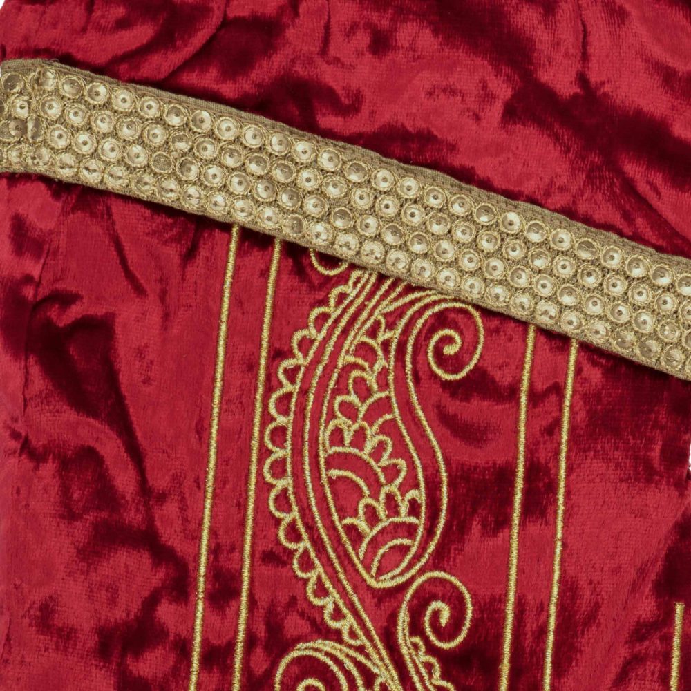 - FARMHOUSE DESIGN Deep country red viscose velvet with vertical gold paisley embroidery