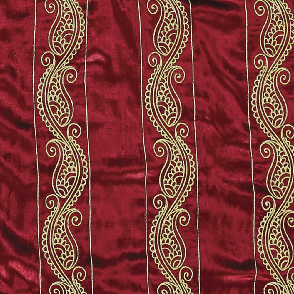 - FARMHOUSE DESIGN Deep country red viscose velvet with vertical gold paisley embroidery