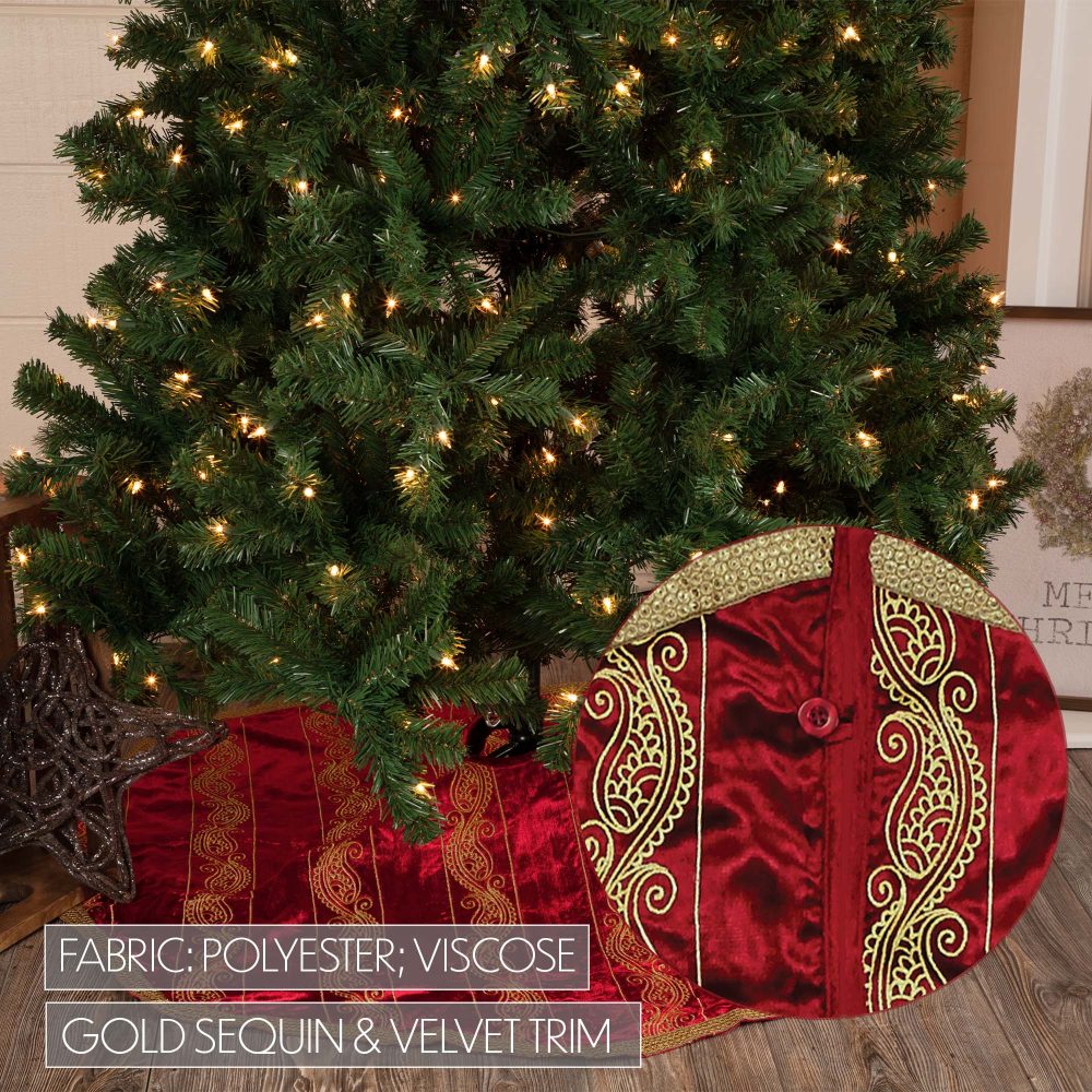 The shiny VHC Brands Christmas Red 48" Yule Tree Skirt is the perfect holiday tree decor item for that rustic and classic feel. You'll enjoy the luxurious velvety feel featuring a modern gold paisley stripe and sequin trimming. Don't worry. There are three button closures and loops to make sure your Yule tree collar stays snugly in place this holiday season. Bring cheer and joy to your tree display this year with the Yule holiday decor collection.