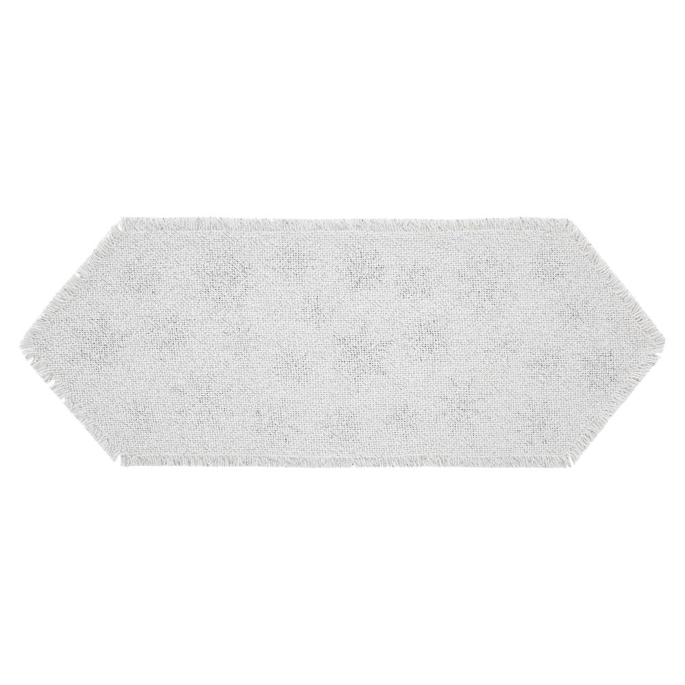 Create an elegant winter table setting with a soft white pattern with neutral gray and silver accents. The Yuletide Burlap Antique White Snowflake Runner includes one 12x36 inch hexagonal table runner constructed with a single layer of cotton burlap fabric with metallic accents. The simple kitchen runner features a bold snowflake pattern in dove grey that brings the wonder of the season to your kitchen table. The antique white runner has a lightly frayed edging for a textured, rustic look. Coordinates with the Yuletide Burlap Collection by VHC for kitchen and home accessories that add casual, neutral elegance to your holiday decor.