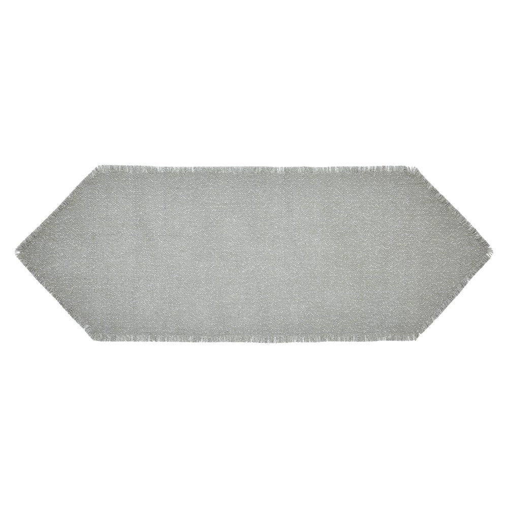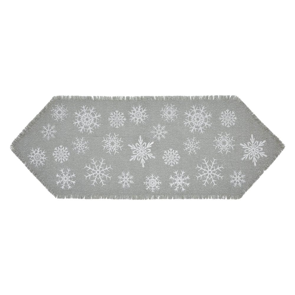 Create an elegant winter table setting with a dove grey pattern with neutral silver accents. The Yuletide Burlap Dove Grey Snowflake Runner includes one 12x36 inch hexagonal table runner constructed with a single layer of cotton burlap fabric with metallic accents. The simple kitchen runner features a bold snowflake pattern in silver that brings the wonder of the season to your kitchen table. The dove grey runner has a lightly frayed edging for a textured, rustic look. Coordinates with the Yuletide Burlap Collection by VHC for kitchen and home accessories that add casual, modern elegance to your holiday decor.