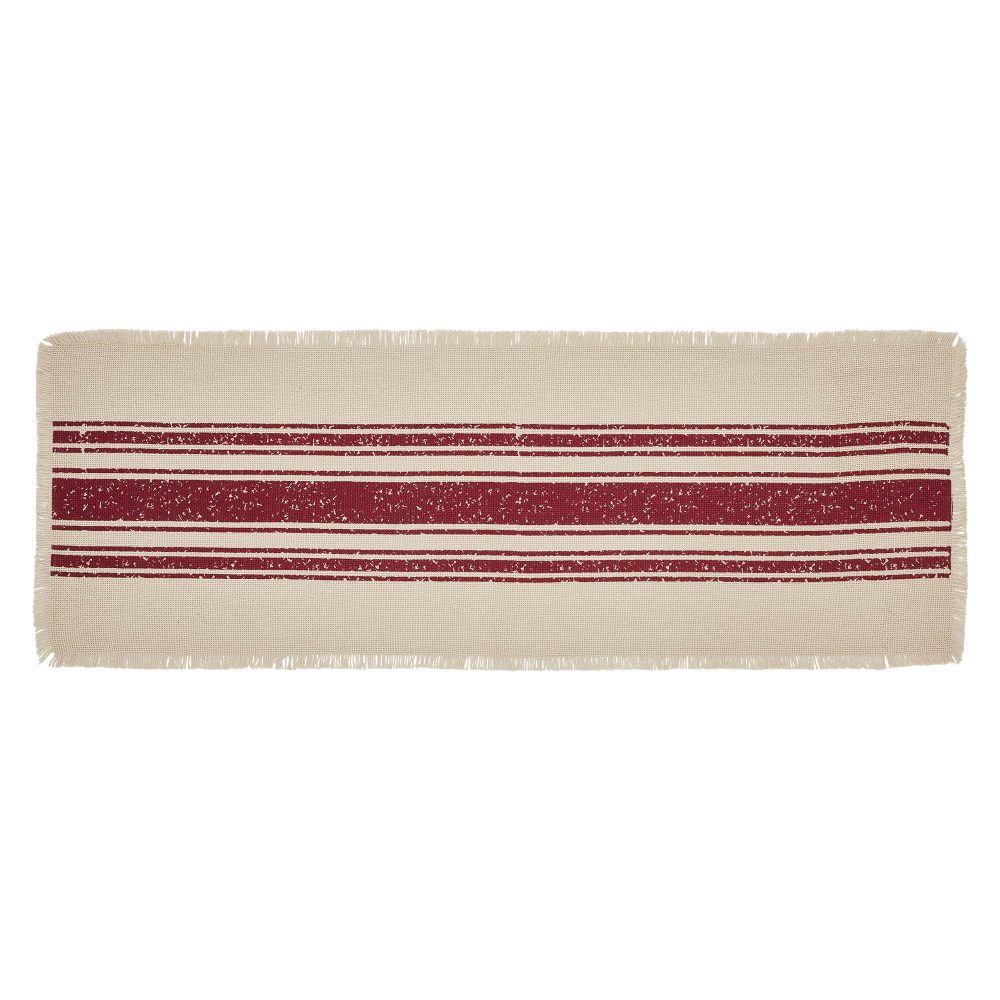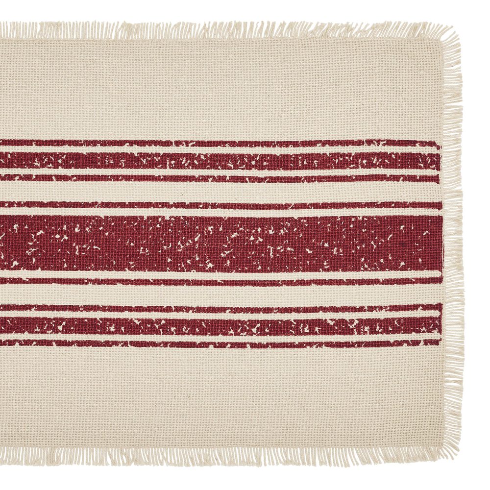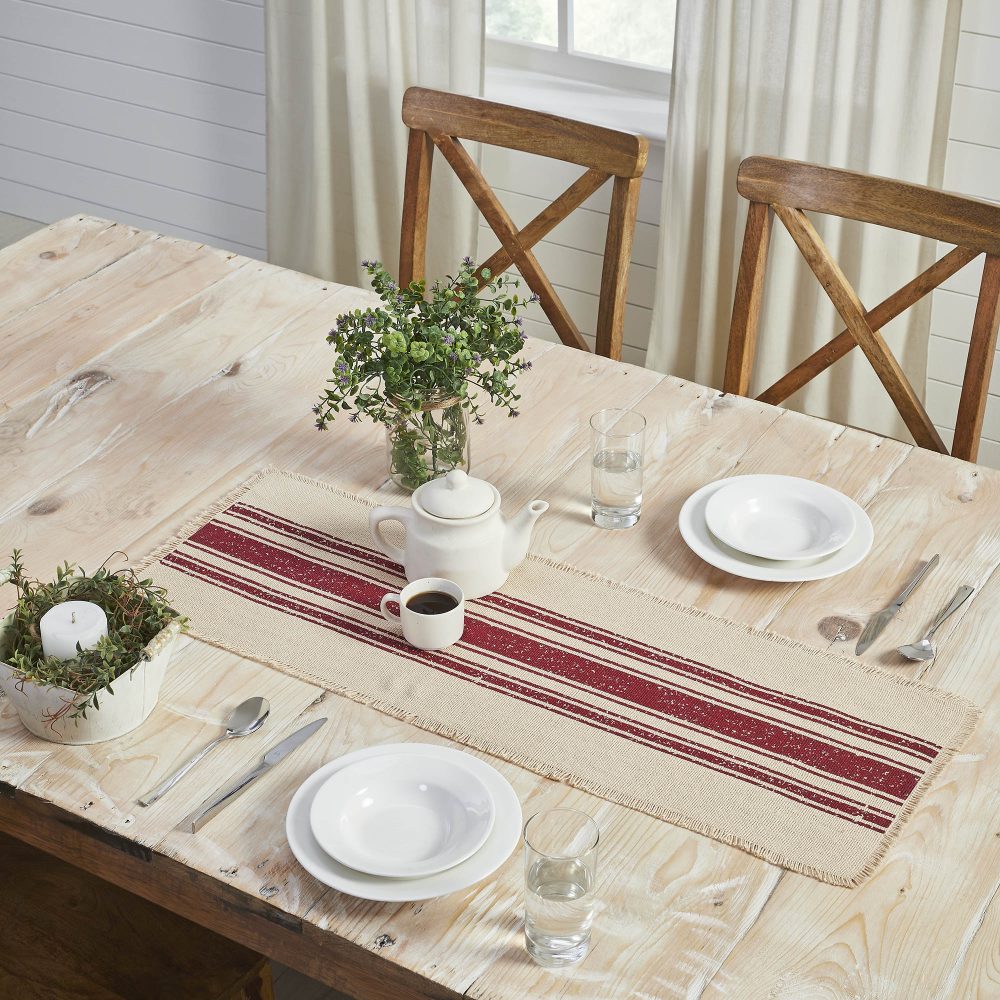 Add a simple, vintage farmhouse inspired accent to your Christmas table decor. The Yuletide Burlap Red Stripe Table Runner measures 12x36 inches. A cotton burlap base in deep creme includes a distressed grainsack stripe pattern in deep red for a look that leans into traditional Christmas colors without being overwhelming. Soft fringed edges add a comforting country feel to the design. Coordinates with the Yuletide Burlap Red Stripe Collection by VHC for more farmhouse inspired Christmas decor.