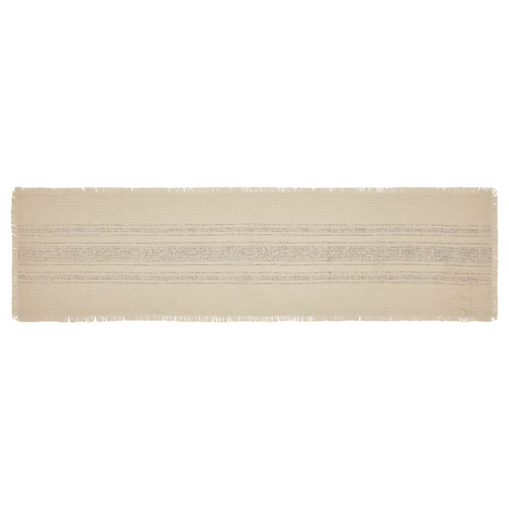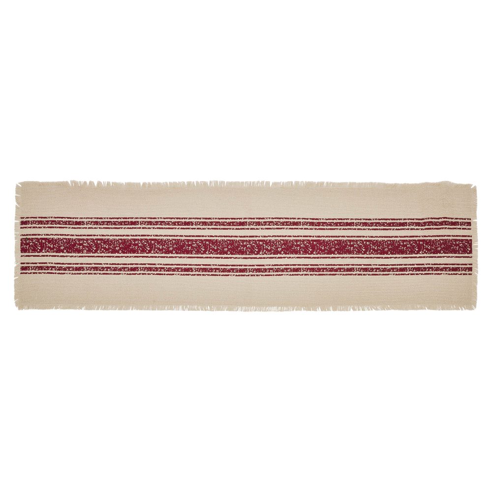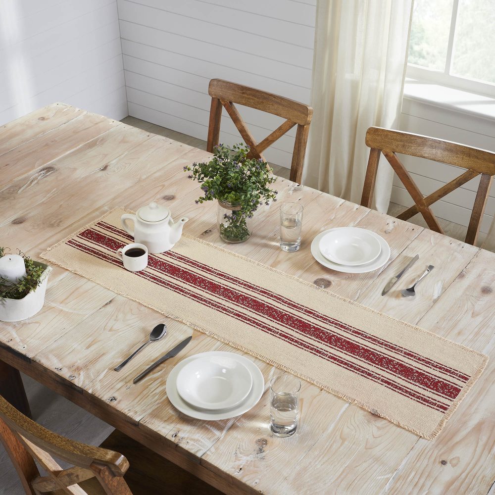 Add a simple, vintage farmhouse inspired accent to your Christmas table decor. The Yuletide Burlap Red Stripe Table Runner measures 12x48 inches. A cotton burlap base in deep creme includes a distressed grainsack stripe pattern in deep red for a look that leans into traditional Christmas colors without being overwhelming. Soft fringed edges add a comforting country feel to the design. Coordinates with the Yuletide Burlap Red Stripe Collection by VHC for more farmhouse inspired Christmas decor.