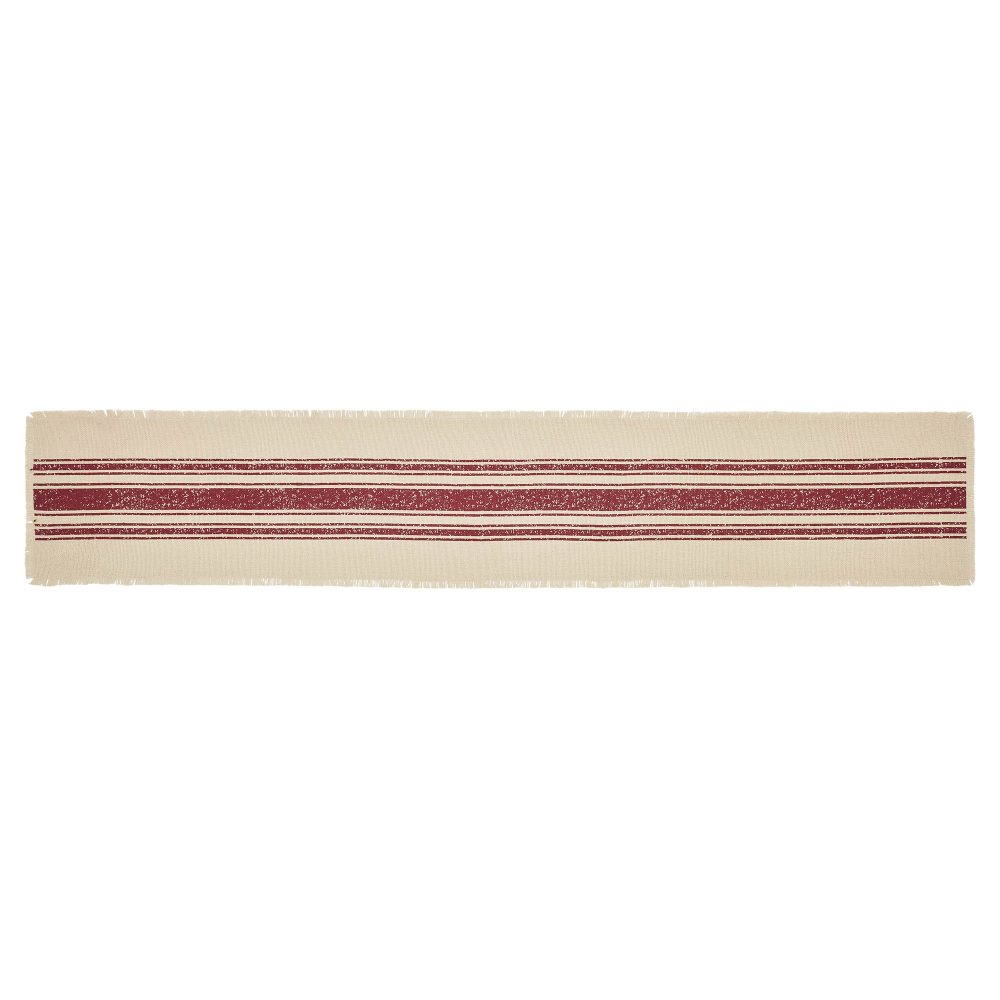 Add a simple, vintage farmhouse inspired accent to your Christmas table decor. The Yuletide Burlap Red Stripe Table Runner measures 12x72 inches. A cotton burlap base in deep creme includes a distressed grainsack stripe pattern in deep red for a look that leans into traditional Christmas colors without being overwhelming. Soft fringed edges add a comforting country feel to the design. Coordinates with the Yuletide Burlap Red Stripe Collection by VHC for more farmhouse inspired Christmas decor.